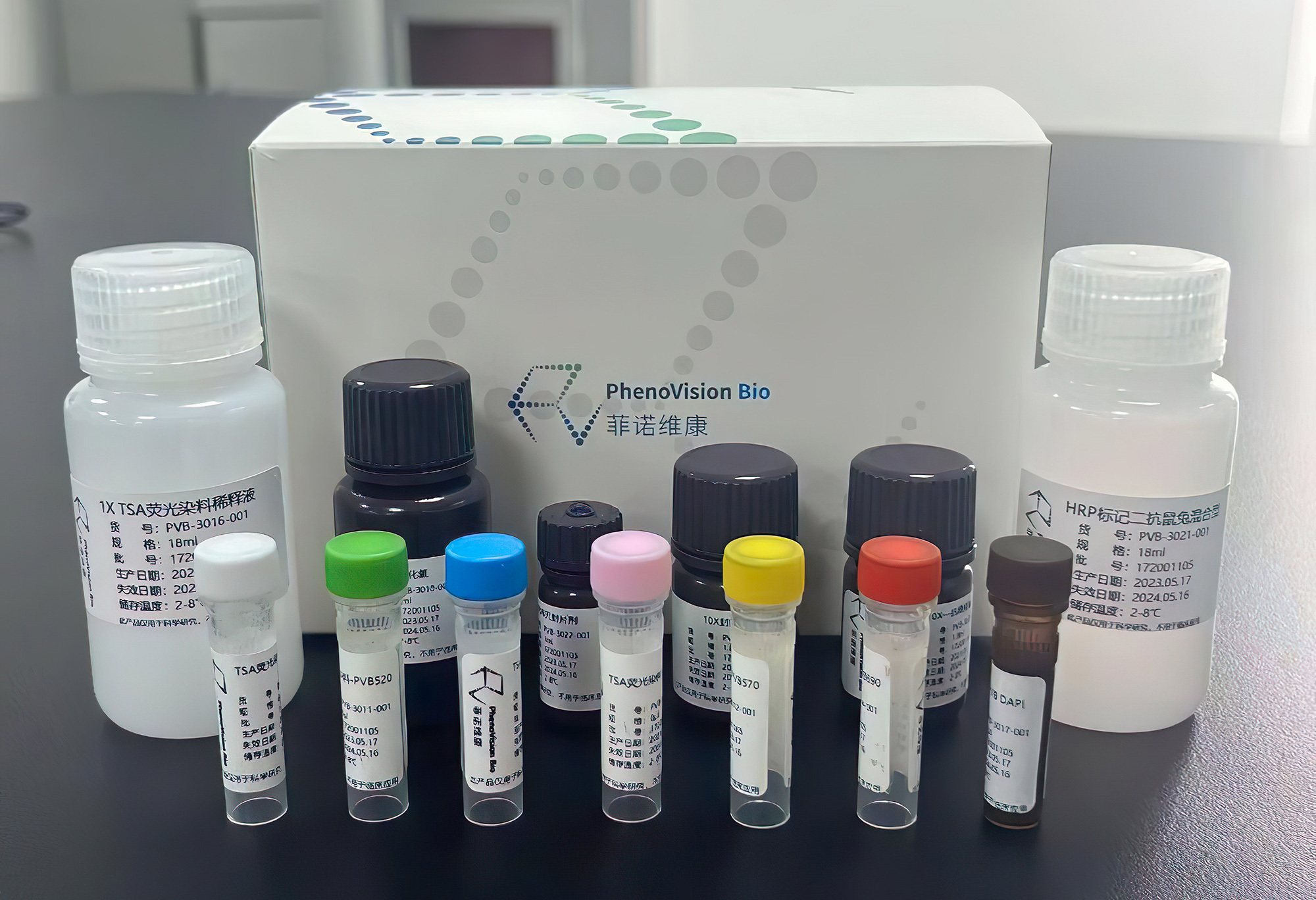 • The Pheno Multiplex Immunofluorescence Detection Kit allows for the simultaneous fluorescent labeling of up to six proteins in FFPE (Formalin-Fixed Paraffin-Embedded) tissue sections. Utilizing Tyramide Signal Amplification (TSA) technology, it can be applied to any type of tissue. This kit enables the study of expression and distribution relationships among multiple proteins at the tissue and cellular levels, making it a powerful tool for in-depth research on tissue microenvironments and the development of biomarkers.